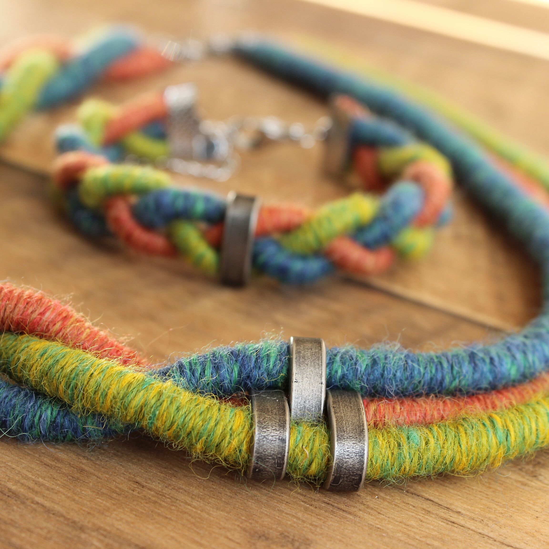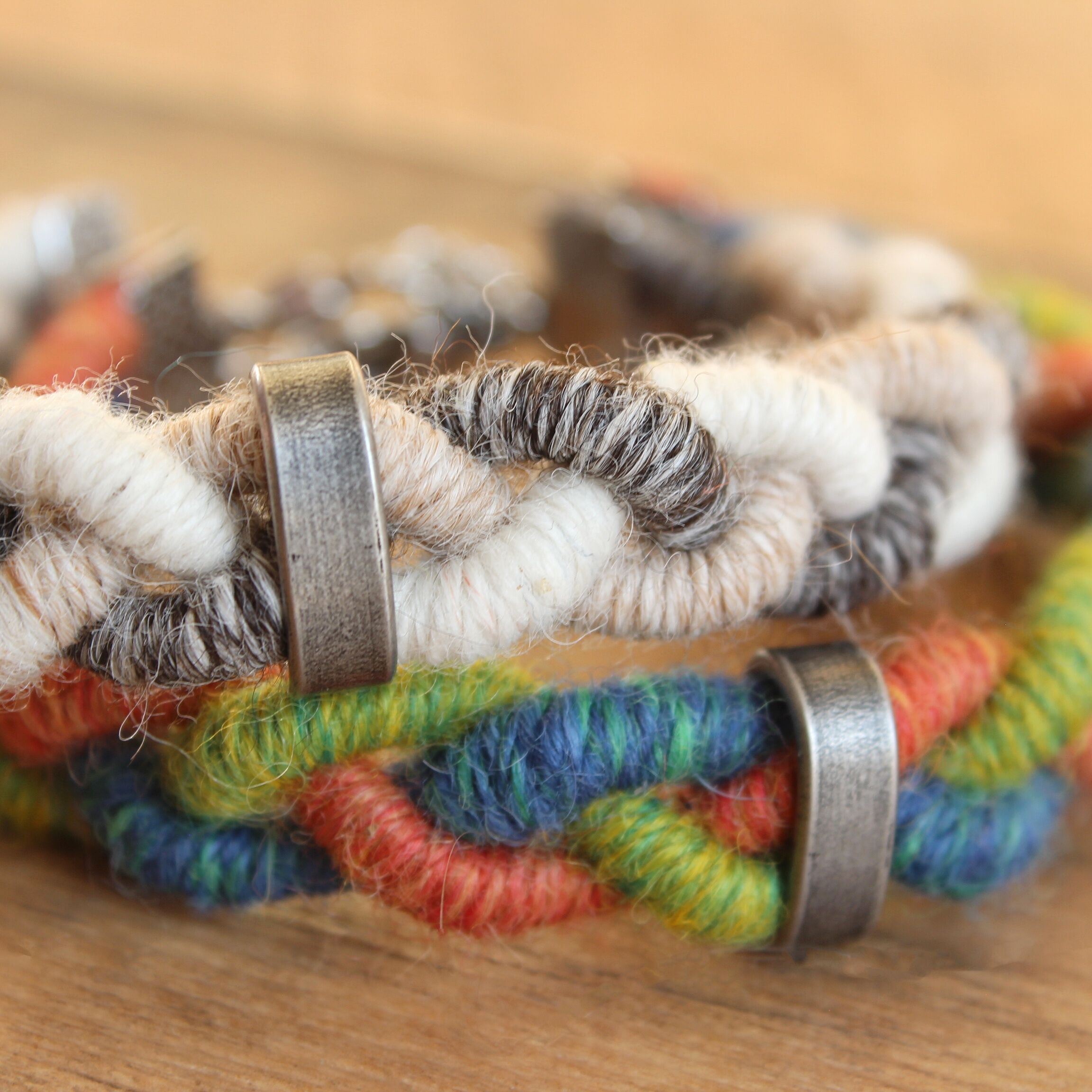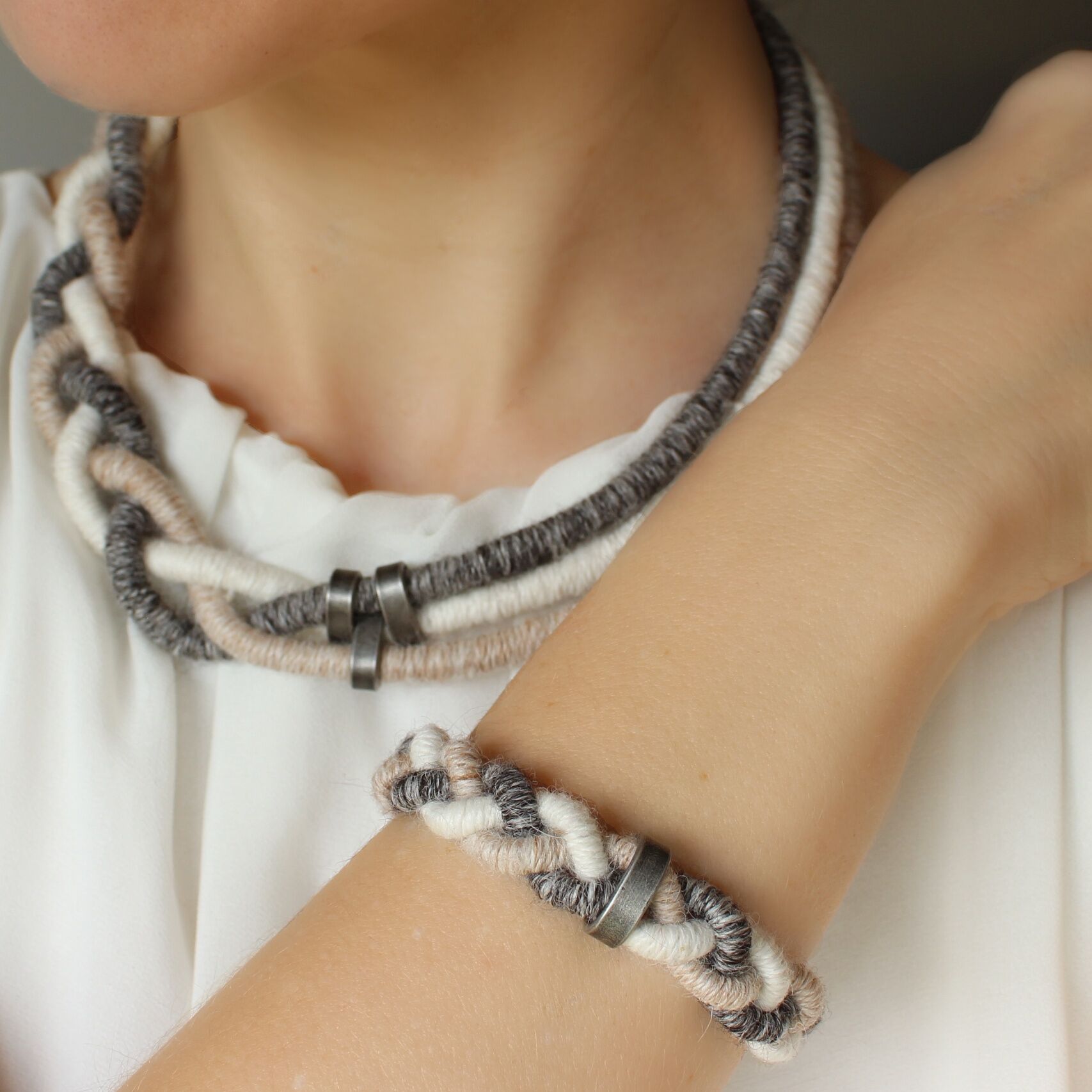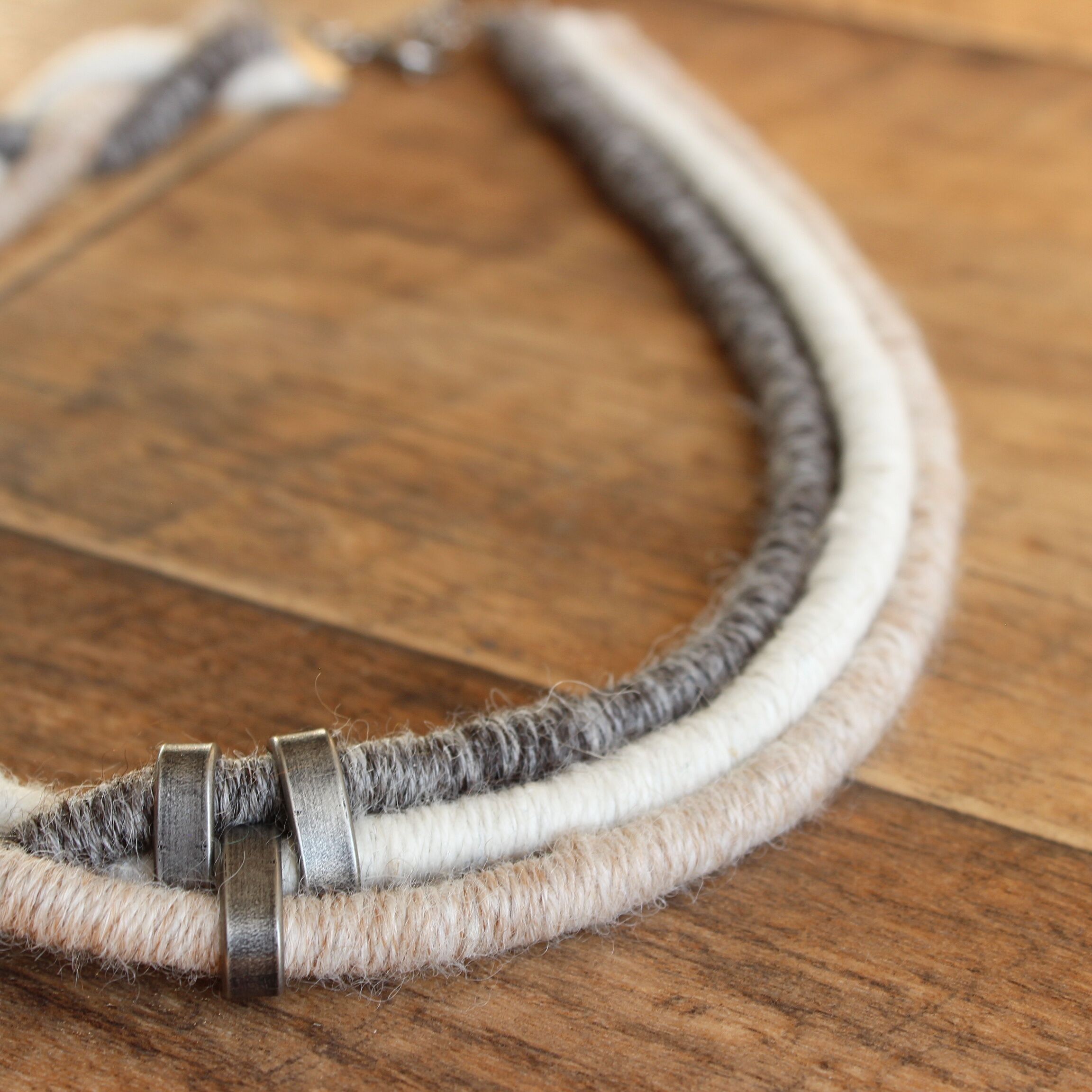 To create these sets I used a technique known as thread wrapping. This technique consists of artfully wrapping alpaca yarn around a cotton core by hand. Thanks to this, the beauty and extraordinary softness of alpaca fleece are presented in a unique way.