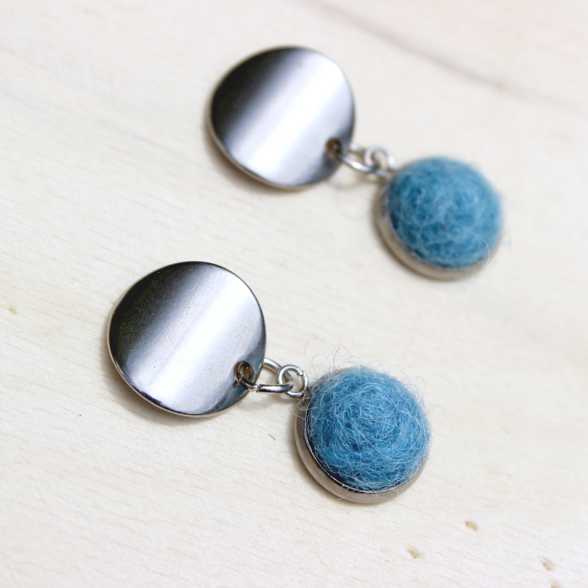 The earrings have been crafted from hand-dyed and then hand-wet-felted alpaca fleece.